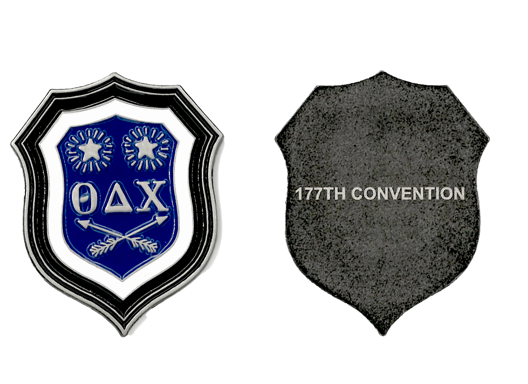 1.5" Ball Marker. Antique silver finish, laser engraved back. In the style of a vintage Theta Delta Chi Brother badge. Produced in limited quantities for the 177th Convention in Williamsburg, Virginia in 2024.